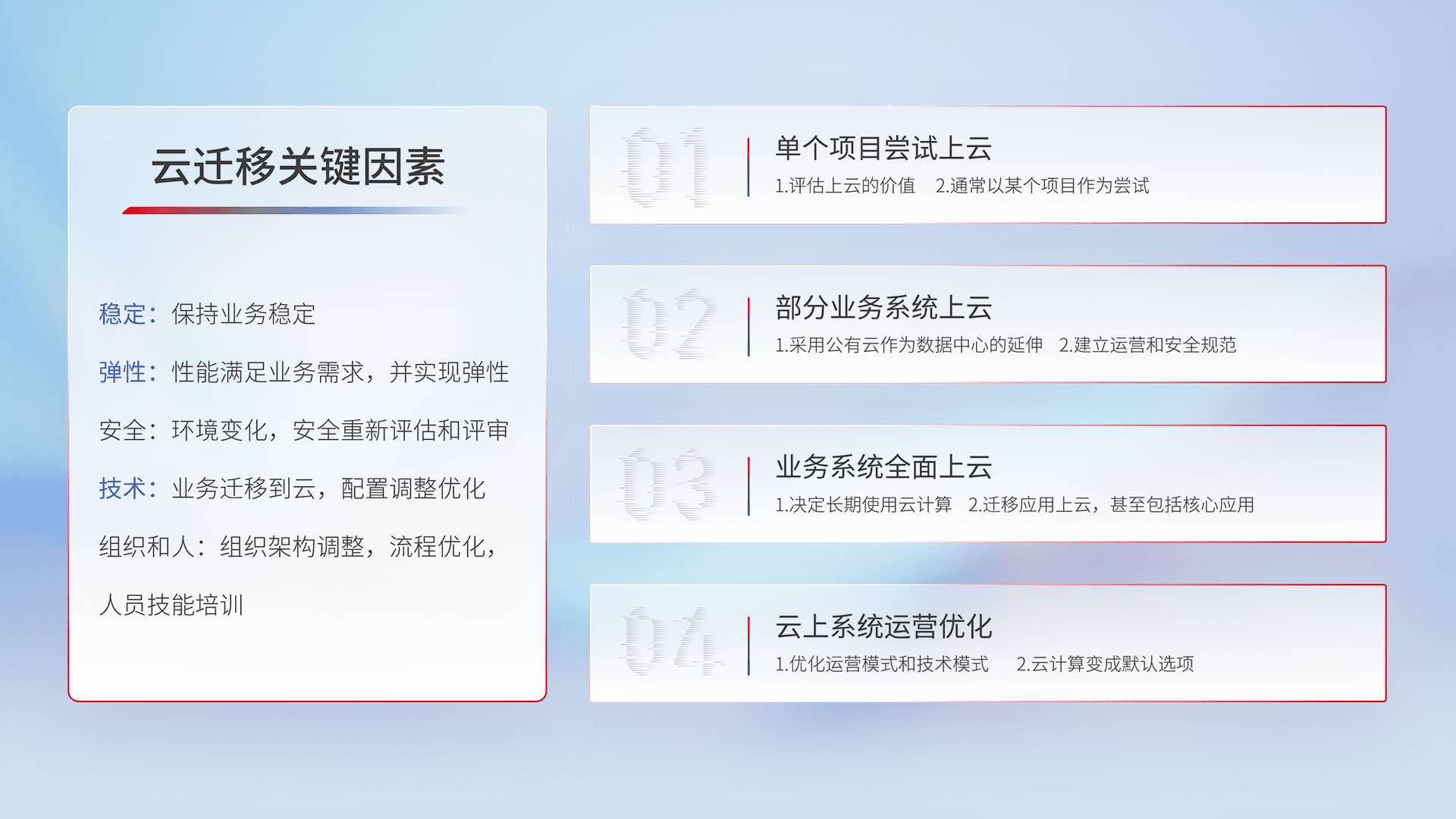 结合实际业务,,,从规划设计、、、、云平台选型、、、云原生改造、、、、数据迁移、、集成交付,,,,迁移全过程为客户识别最佳上云路径,,,做好风险识别管理,,,,设计网络架构、、、身份权限、、安全审计合规、、、、操作审计、、、、日志审计、、、监控告警策略、、、、多站点容灾设计等,,,对云上基础设施进行整体规划,,,提升IT治理水平,,,,以满足弹性、、、、高可用、、、高性能的需求。。。